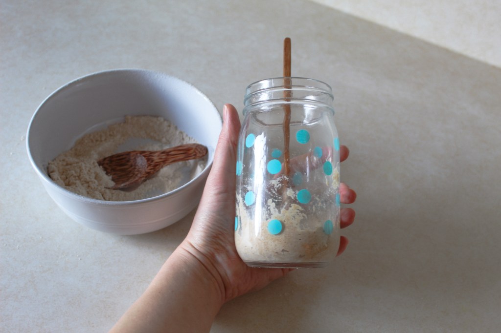 Pour the water into a jar, add the starter and then start adding flour. If you have kitchen scales you can weigh all the ingredients and mix them right away. If you don’t, start with 6 spoonfuls of flour into the water and starter and keep mixing and adding a little more flour until you reach the consistency of peanut butter.