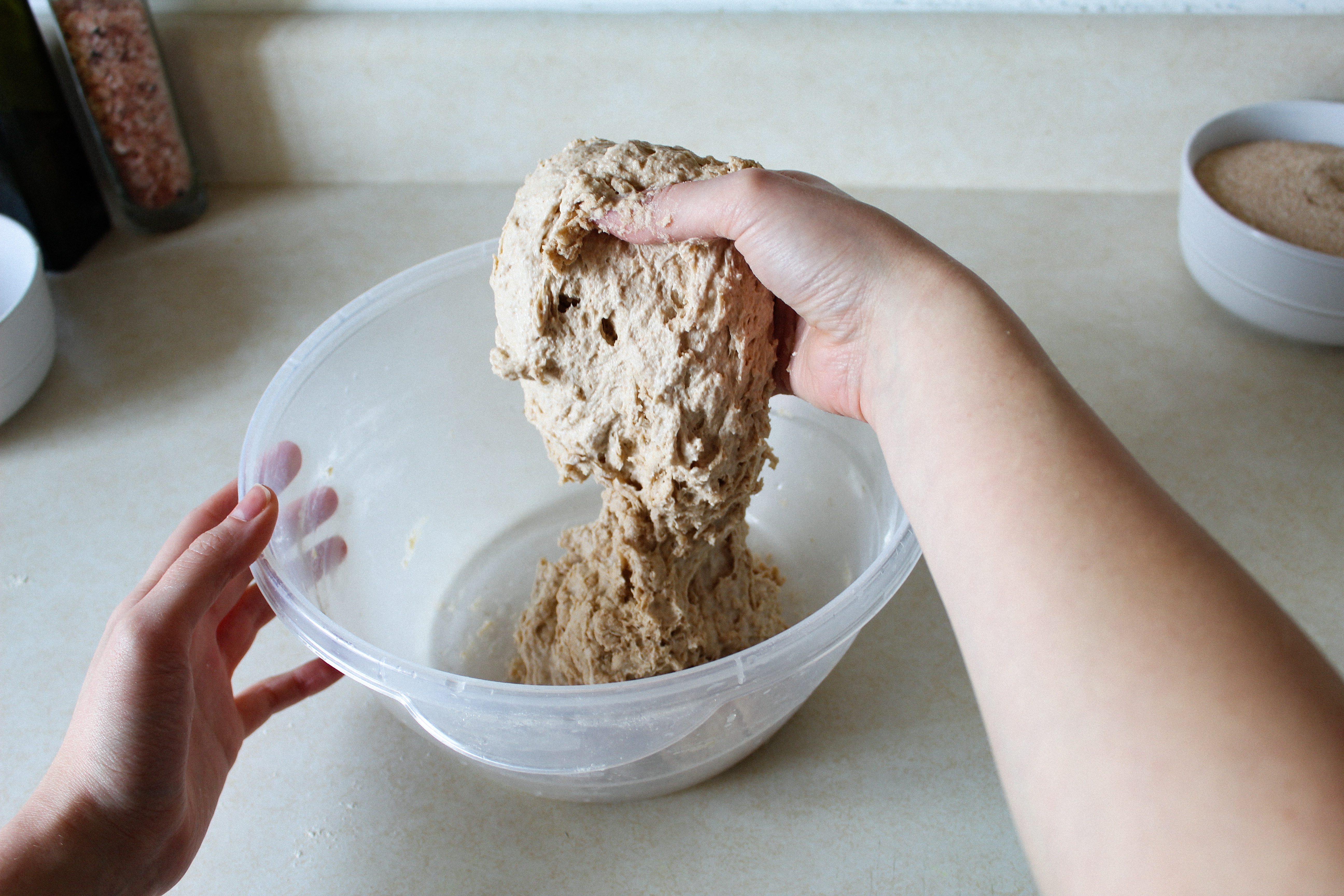 After 30 minutes you will start working the dough. This stage is different from kneading, although it does to your dough what kneading would do, making it strong and elastic. To achieve this bakers use a technique called stretch-and-fold where you grab about a third of the dough from underneath, stretch it upwards, and then fold it either on top or underneath the rest. After you have stretched and folded the dough from one side, rotate the bowl a little and stretch and fold again. Rotate and repeat until you reach the starting point. You should make about 4-5 stretches. The video below illustrates how to perform this step.