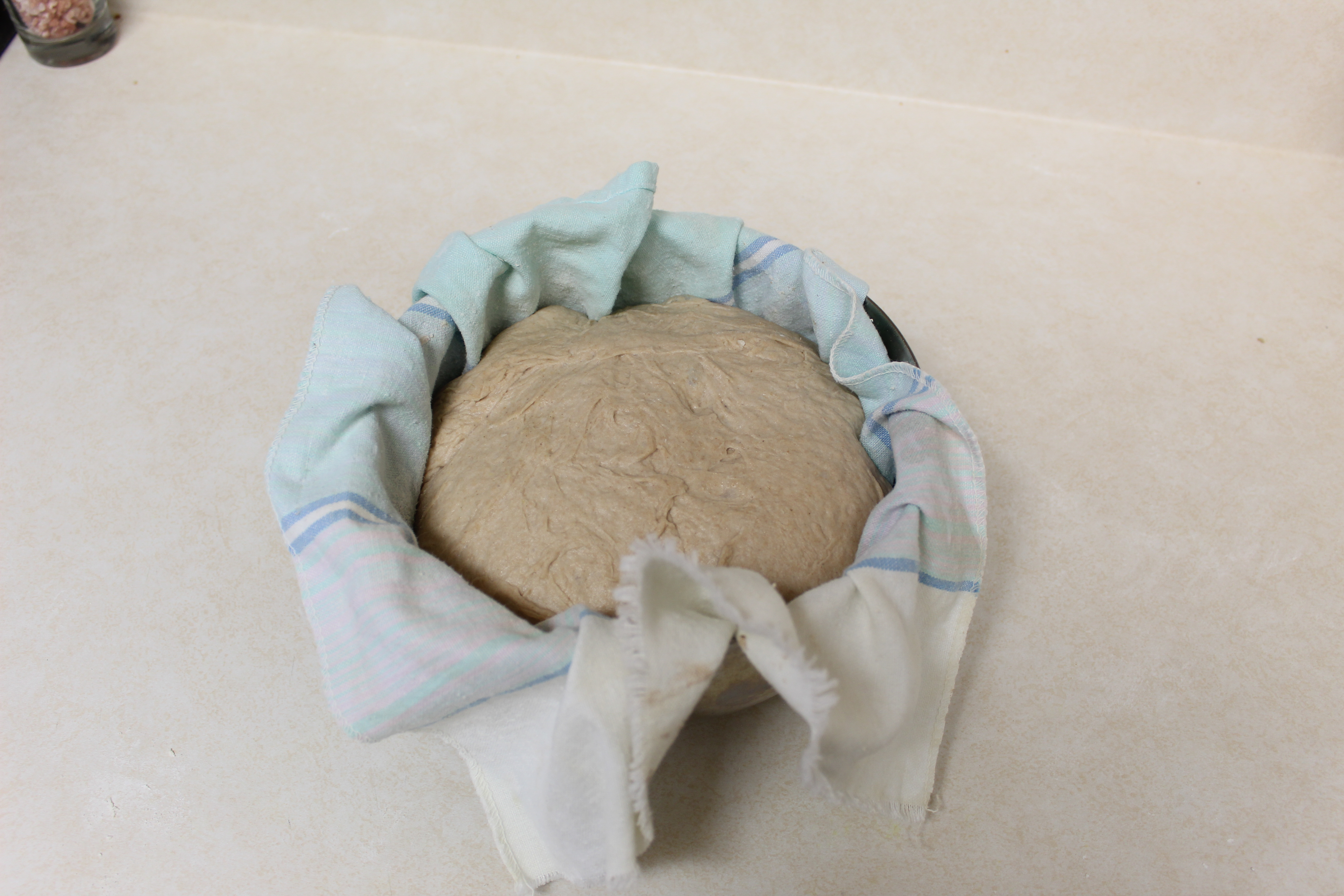 As the bread-to-be is getting ready for the final shape, prepare your makeshift bread basket. Take a medium-sized bowl, line it with a clean linen or cotton towel and dust it with flour.