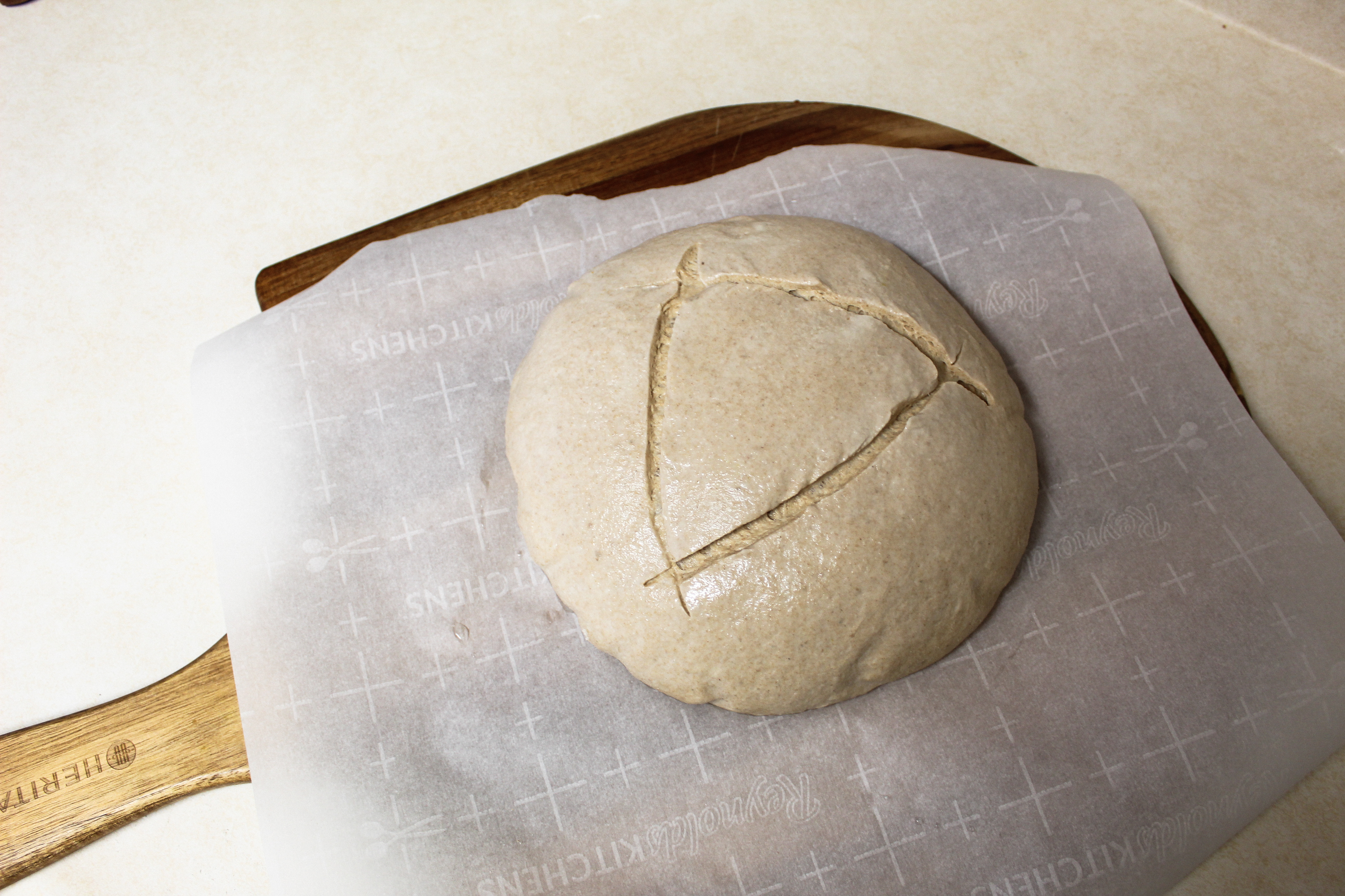 Take a square of parchment paper large enough to cover the bowl. Put it on top of the bread and cover it with a pizza peel, a cookie sheet or a large wooden cutting board. Flip! Remove the bowl and the towel to reveal the face of the bread. If the towel stuck to the dough – don’t worry! Simply wet the stuck spot and it will peel right off. For a bubbly, crunchy crust wet your bread generously.